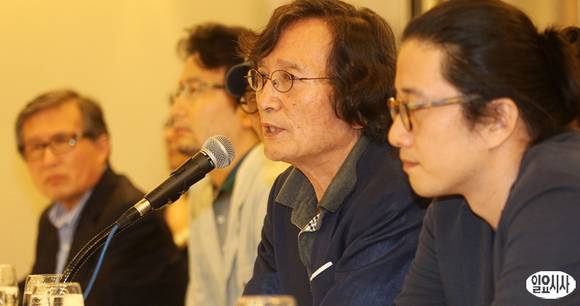 9일 오전 서울 중구 프레스센터에서 열린 영화 '천안함 프로젝트' 상영 중단에 대한 영화인들의 긴급 기자회견에서 제작자인 정지영 감독이 취재진의 질문에 답하고 있다.
