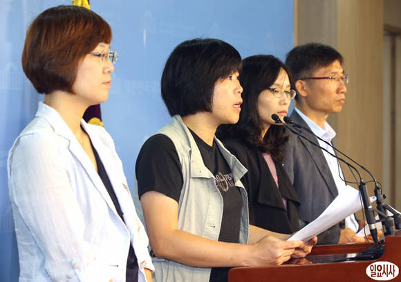 9일 오전, 국회 정론관에서 내란음모 및 국가보안법 위반 혐의로 구속된 홍순석 통합진보당 경기도당 부위원장, 이상호 경기진보연대 고문, 한동근 통합진보당 전 수원시위원장 등 가족들이 인권침해 규탄 기자회견을 갖고 있다.