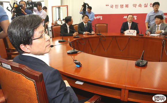 황교안 법무부장관(사진 왼쪽)이 9일 오후, 서울 여의도 국회에서 열린 법무부 당정협의회에 참석해 새누리당 황우여 대표 맞은 편에 착석해 있다.