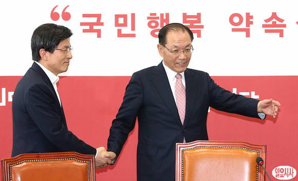 새누리당 황우여 대표(사진 오른쪽)가 9일 오후, 서울 여의도 국회에서 열린 법무부 당정협의회에 참석한 황교안 법무무장관에게 자리를 안내해 주고 있다.