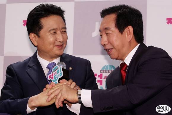 9일 오후 서울 중구 순화동 호암아트홀에서 열린 JTBC 프로그램 '적과의 동침' 제작발표회에서 김영환 민주당 의원과 김성태 새누리당 의원이 서로 마이크를 양보하고 있다.