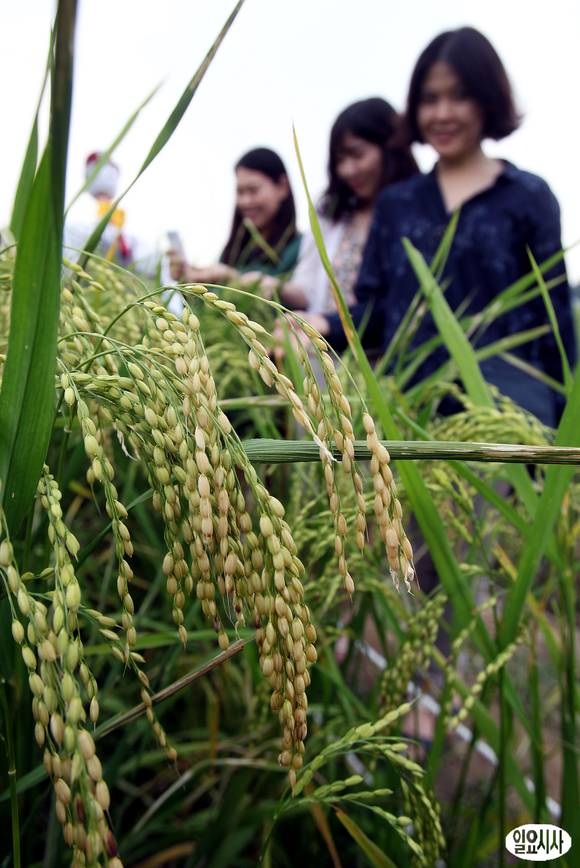 선선한 가을 날씨를 보인 9일 오후 서울 방이동 올림픽공원 몽촌토성 내성농장에서 시민들이 익어가는 벼를 바라보며 가을 정취를 느끼고 있다.