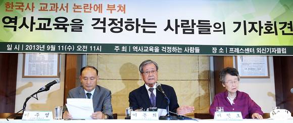 11일 오전 서울 중구 프레스센터에서 역사교육을 걱정하는 사람들 주최로 열린 기자회견에서 이돈희 전 교육부 장관(가운데)이 성명서를 발표하고 있다. 사진 왼쪽부터 이주영 건국대 명예교수, 이 전 장관, 이인호 서울대 명예교수.