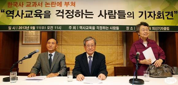 11일 오전 서울 중구 프레스센터에서 역사교육을 걱정하는 사람들 주최로 열린 기자회견을 마친 참석자들이 자리에서 일어나고 있다. 사진 왼쪽부터 이주영 건국대 명예교수, 이돈희 전 교육부 장관, 이인호 서울대 명예교수.
