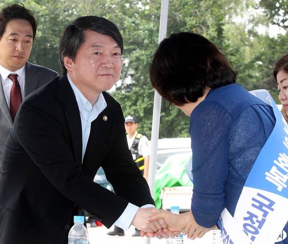 무소속 안철수 의원이 노숙투쟁 중인 김한길 대표를 예방하기 위해 12일 오전 서울광장에 설치된 민주당 천막당사를 찾아 관계자들과 인사하고 있다.