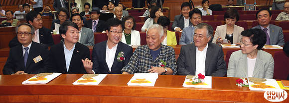 12일 오후 국회 헌정기념관에서 열린 '제4회 노무현 대통령 기념 학술 심포지엄-2013 한국민주주의 위기진단과 재민주화를 위한 모색'이 열리고 있는 가운데, 이병완 노무현재단 이사장, 무소속 안철수 의원, 정의당 천호선 대표, 민주당 김한길 대표, 문재인 의원, 한명숙 전 총리(사진 왼쪽부터)가 참석해 이야기를 나누고 있다.