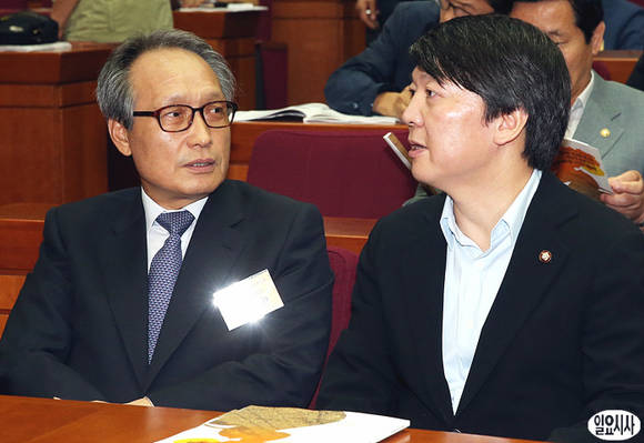 12일 오후 국회 헌정기념관에서 열린 '제4회 노무현 대통령 기념 학술 심포지엄-2013 한국민주주의 위기진단과 재민주화를 위한 모색' 세미나가 열리고 있는 가운데, 이병완 노무현재단 이사장(사진 왼쪽)과 무소속 안철수 의원이 대화를 나누고 있다.