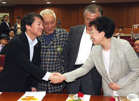 12일 오후 국회 헌정기념관에서 열린 '제4회 노무현 대통령 기념 학술 심포지엄-2013 한국민주주의 위기진단과 재민주화를 위한 모색' 세미나가 열리고 있는 가운데, 무소속 안철수 의원(사진 왼쪽)과 한명숙 전 총리가 악수를 나누고 있다.