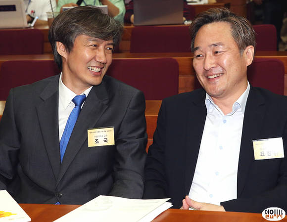 12일 오후 국회 헌정기념관에서 열린 '제4회 노무현 대통령 기념 학술 심포지엄-2013 한국민주주의 위기진단과 재민주화를 위한 모색' 세미나가 열린 가운데, 조국 서울대 법학전문대학원 교수(사진 왼쪽)와 표창원 전 경찰대 교수가 참석해 이야기 도중 웃음 짓고 있다.