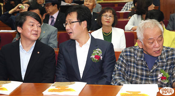 12일 오후 국회 헌정기념관에서 열린 '제4회 노무현 대통령 기념 학술 심포지엄-2013 한국민주주의 위기진단과 재민주화를 위한 모색' 세미나가 열린 가운데, 무소속 안철수 의원(사진 왼쪽)과 진보정의당 천호선 대표가 참석해 이야기를 나누고 있다.