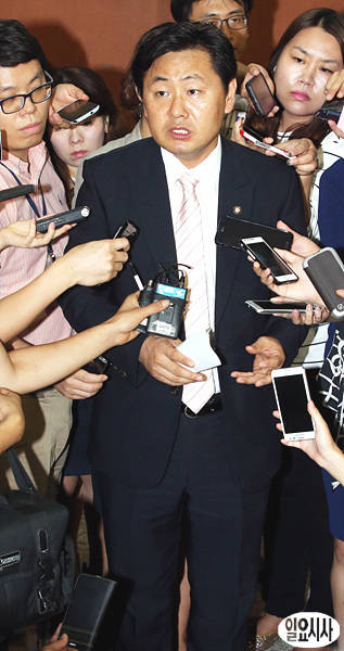 12일 오후, 민주당 김관영 원내대변인이 국회 정론관에서 청와대 3자 회담 관련 기자회견 후 취재진의 질문에 답변하고 있다.