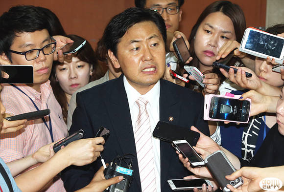 12일 오후, 민주당 김관영 원내대변인이 국회 정론관에서 청와대 3자 회담 관련 기자회견 후 취재진의 질문에 답변하고 있다.