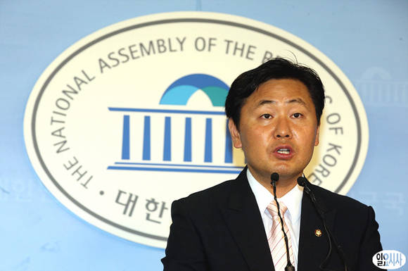 12일 오후, 민주당 김관영 원내대변인이 국회 정론관에서 청와대 3자 회담 관련 기자회견을 하고 있다.
