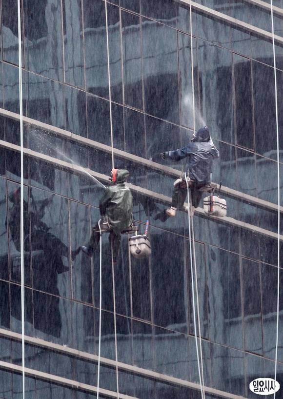 서울을 비롯한 경기도와 강원도영서 일부지역에 호우특보가 내려진 13일 오전 서울 중구의 한 빌딩에서 작업자들이 건물 외벽을 물청소 하고 있다.