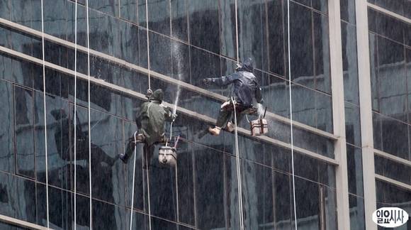 서울을 비롯한 경기도와 강원도영서 일부지역에 호우특보가 내려진 13일 오전 서울 중구의 한 빌딩에서 작업자들이 건물 외벽을 물청소 하고 있다.