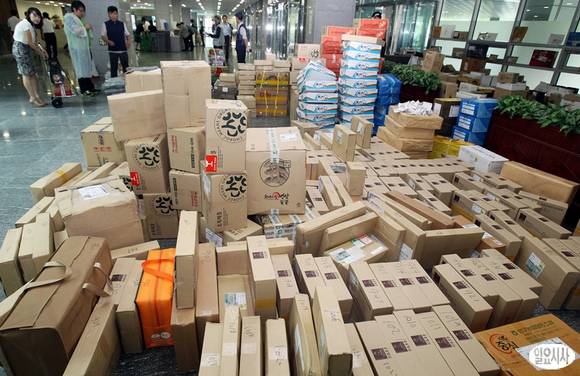민족 대명절인 추석을 얼마 앞둔 13일 서울 여의도 국회 의원회관 로비 한 켠에 각종 선물 택배가 가득 쌓여 있다.