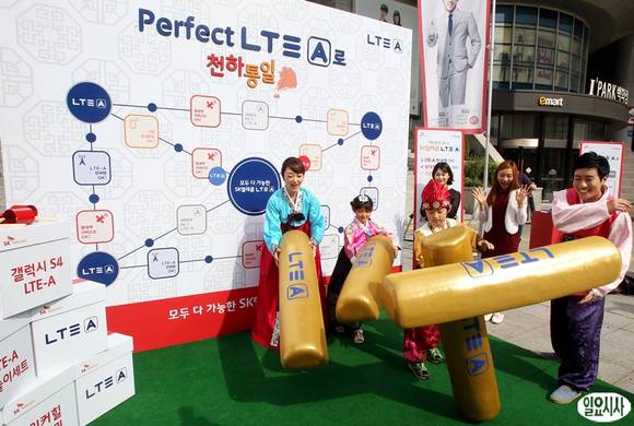 SK텔레콤이 15일 오전 서울 용산역 아이파크몰 앞 야외광장에서 추석을 맞아 황금주파수로 차별화된 'Perfect LTE-A'의 앞선 서비스를 알리고, 국민 모두가 즐거운 명절 보내기를 기원하는 '황금 윷놀이' 이벤트를 진행하고 있다.