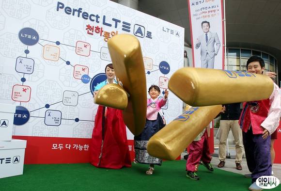 SK텔레콤이 15일 오전 서울 용산역 아이파크몰 앞 야외광장에서 추석을 맞아 황금주파수로 차별화된 'Perfect LTE-A'의 앞선 서비스를 알리고, 국민 모두가 즐거운 명절 보내기를 기원하는 '황금 윷놀이' 이벤트를 진행하고 있다.