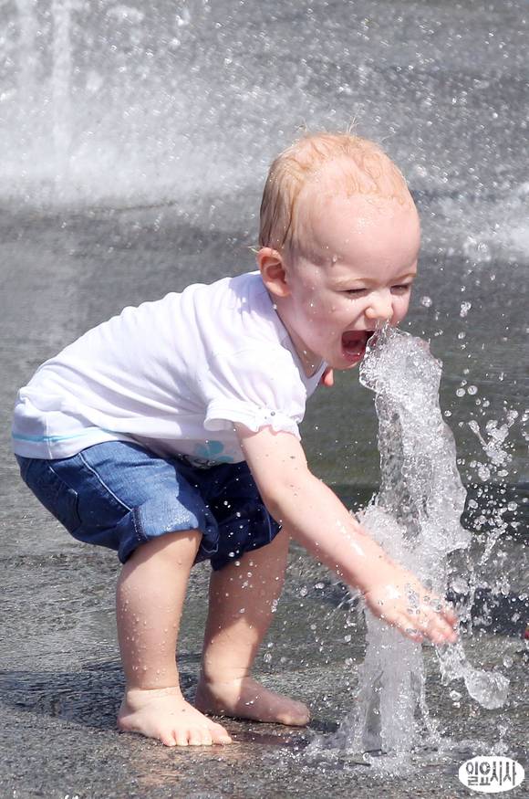 막바지 무더위가 기승을 부린 15일 서울 광화문광장 분수대을 찾은 한 외국인 아이가 물놀이를 하며 더위를 식히고 있다.