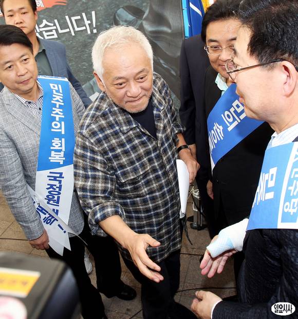 김한길 민주당 대표가 15일 오후 서울 서울시청 앞 광장 천막당사에서 긴급기자회견을 마친 뒤 동료의원들과 인사를 나누고 있다.
