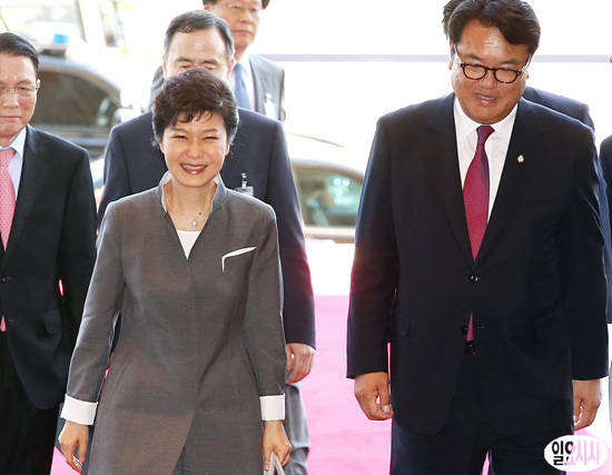 박근혜 대통령이 16일 오후, 새누리당 황우여·민주당 김한길 대표와의 3자회담 위해 국회를 방문한 가운데, 정진석 사무총장가 함께 사랑재로 이동하고 있다.