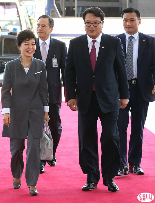 박근혜 대통령이 16일 오후, 새누리당 황우여·민주당 김한길 대표와의 3자회담 위한 방문에서 정진석 국회 사무총장의 영접을 받고 있다.