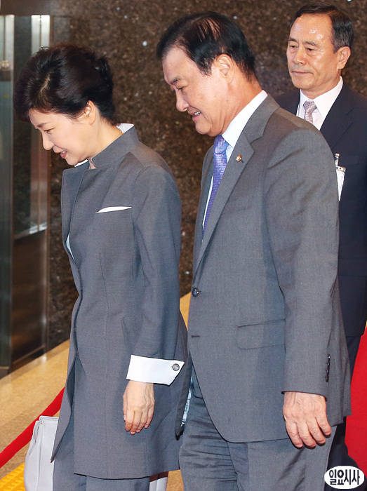 박근혜 대통령이 16일 오후, 새누리당 황우여·민주당 김한길 대표와의 3자회담 위해 국회를 방문한 가운데, 강창희 국회의장과 함께 이동하고 있다.
