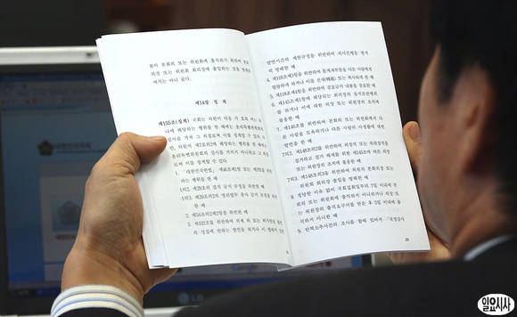 윤리특별위원회 한 관계자가 16일, 국회 윤리특위회의실에서 열린 통합진보당 이석기·김재연 의원의 자격심사안 논의 자리에서 관련 책자를 보고 있다.