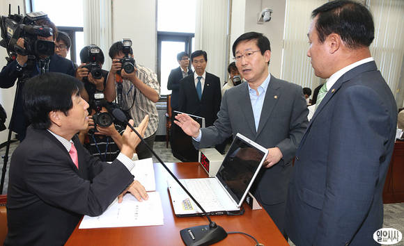 박범계 야당 윤리특별위원회 간사와 여당 의원들이 16일, 국회 윤리특위회의실에서 열린 통합진보당 이석기·김재연 의원의 자격심사안에 대한 논의를 갖고 있다.