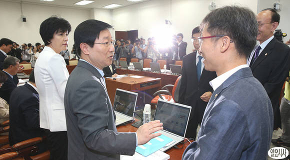 윤리특별위원회 민주당 박범계 의원과 통합진보당 이상규 의원이 16일, 국회 윤리특위회의실에서 열린 통합진보당 이석기·김재연 의원의 자격심사안 논의 자리에서 대화를 나누고 있다.