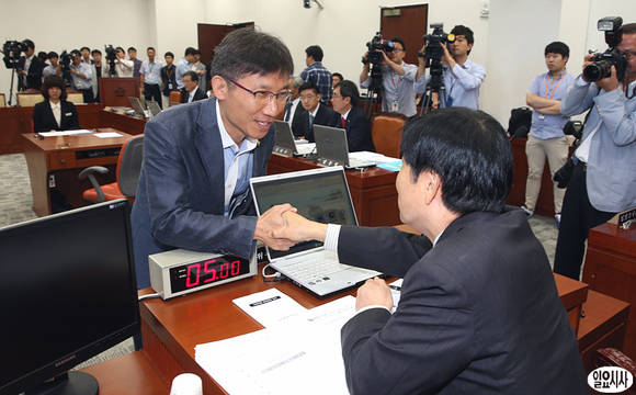 통합진보당 이석기, 김재연 의원에 대한 자격심사안을 논의하는 국회 윤리특별위원회가 16일, 서울 여의도 국회에서 열린 가운데 이상규 통합진보당 의원이 장윤석 윤리특위 위원장과 악수를 나누고 있다.