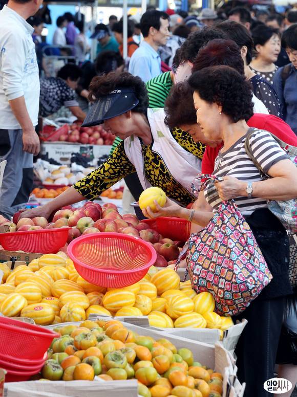 민족 대명절인 추석을 앞둔 16일 오후 서울 동대문구 제기동 경동시장에서 시민들이 제수용 과일을 구매하고 있다.