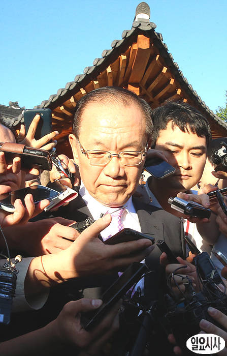 새누리당 황우여 대표가 16일 오후, 국회 사랑재에서 박근혜 대통령, 김한길 민주당 대표와 3자 회담을 마친 후 취재진의 질문을 받고 있다.