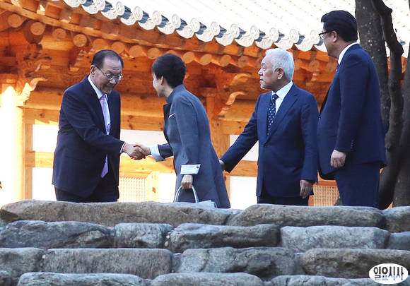 박근혜 대통령이 16일 오후 국회 사랑재에서 황우여 새누리당 대표, 김한길 민주당 대표와 3자 회담을 마친 후 황 대표와 악수를 나누고 있다.