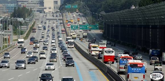 본격적인 추석연휴를 앞둔 17일 오전 경기도 성남시 궁내동 서울톨게이트 서울-부산방면 경부고속도로에 귀성차량들이 차츰 몰리고 있다. 한국도로공사는 이날 43만 대가 서울을 빠져나갈 것으로 예상하며, 정오부터 귀성 차량이 몰려 저녁에 정체가 가장 심하고 자정쯤이면 정체가 풀릴 것으로 전망했다.