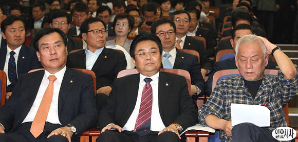 23일 오전, 민주당 김한길 대표(사진 오른쪽), 전병헌 원내대표(사진 가운데), 박기춘 사무총장 등이 국회에서 열린 민주당 의원총회 참석 자리에서 피곤한 표정을 짓고 있다.