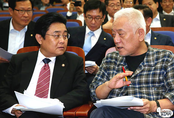 23일 오전, 민주당 김한길 대표(사진 오른쪽), 전병헌 원내대표(사진 가운데), 박기춘 사무총장 등이 국회에서 열린 민주당 의원총회에 참석한 가운데 김 대표와 전 원내대표가 이야기를 나누고 있다.