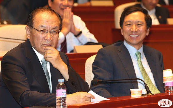 23일 오후, 새누리당 황우여 대표가 국회 예결위 회의장서 열린 의원총회에 참석해 정기 국회와 관련해 고심하고 있는 가운데, 황 대표 옆으로 활짝 웃고 있는 김기현 정책위의장의 미소가 묘한 대조를 이루고 있다.