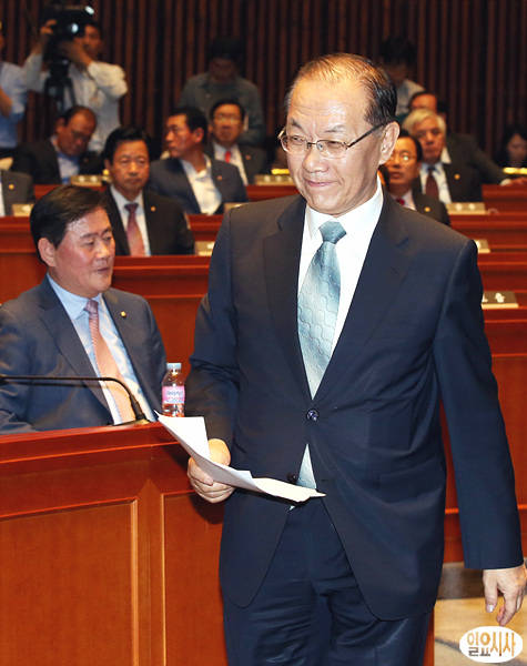 23일 오후, 새누리당 황우여 대표가 국회 예결위 회의장서 열린 의원총회에 참석해 정기 국회와 관련해 모두발언 후 자신의 자리로 이동하면서 웃음 짓고 있다.