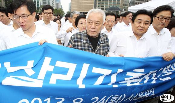김한길 민주당 대표와 전병헌 민주당 원내대표를 비롯한 지도부들이 24일 오전 서울광장 천막당사에서 열린 민주·민생살리기 출정 결의대회를 마친 뒤 광화문광장으로 이동하고 있다.