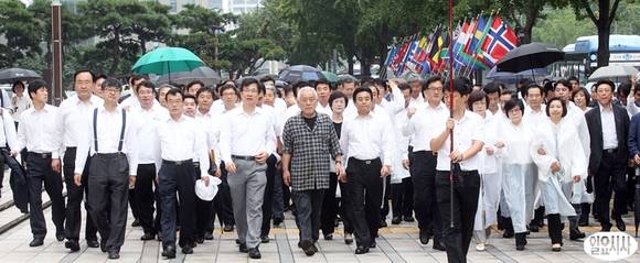 김한길 민주당 대표와 전병헌 민주당 원내대표를 비롯한 의원들이 24일 오전 서울광장 천막당사에서 열린 민주·민생살리기 출정 결의대회를 마친 뒤 광화문광장으로 이동하고 있다.