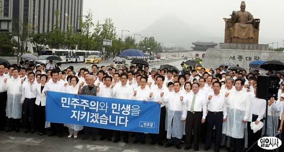 김한길 민주당 대표와 전병헌 민주당 원내대표를 비롯한 의원들이 24일 오전 서울광장 천막당사에서 열린 민주·민생살리기 출정 결의대회를 마친 뒤 광화문광장으로 이동해 구호를 외치고 있다.