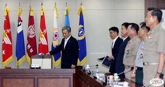 김관진 국방부 장관이 24일 오후 서울 용산구 국방부 중회의실에서 열린 차기전투기 선정을 위한 방위사업추진위원회 회의에 참석하고 있다.