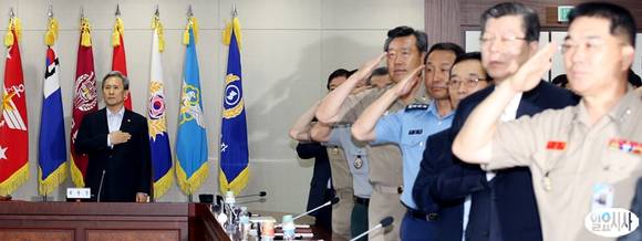 24일 오후 서울 용산구 국방부 중회의실에서 열린 차기전투기 선정을 위한 방위사업추진위원회 회의에서 김관진 국방부 장관을 비롯한 참석자들이 국민의례를 하고 있다.