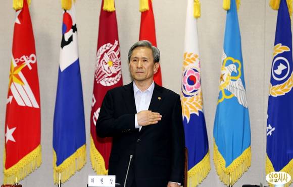 김관진 국방부 장관이 24일 오후 서울 용산구 국방부 중회의실에서 열린 차기전투기 선정을 위한 방위사업추진위원회 회의에 참석, 국민의례를 하고 있다.