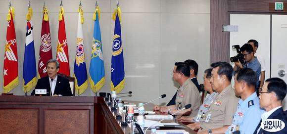 김관진 국방부 장관이 24일 오후 서울 용산구 국방부 중회의실에서 열린 차기전투기 선정을 위한 방위사업추진위원회 회의에 참석, 인사말을 하고 있다.