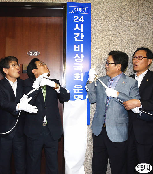 민주당이 24일 오후, 원내투쟁의 지휘본부 격인 24시간 비상국회운영본부를 구성한 가운데, 전병헌 원내대표와 우원식 최고위원 등이 현판식을 갖고 있다.