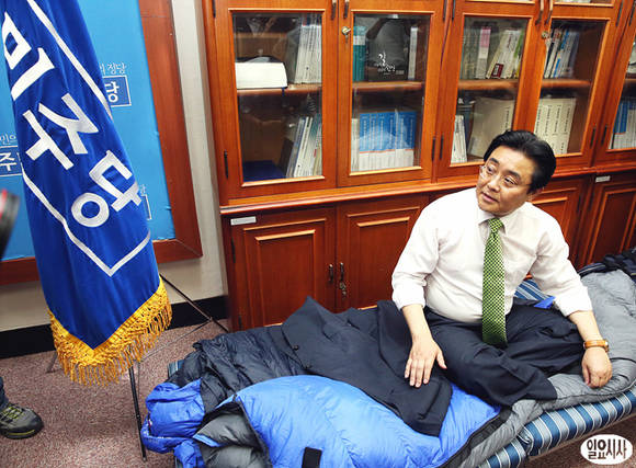 민주당이 24일 오후, 원내투쟁의 지휘본부 격인 24시간 비상국회운영본부를 구성한 가운데, 전병헌 원내대표가 당기를 바라보고 있다.