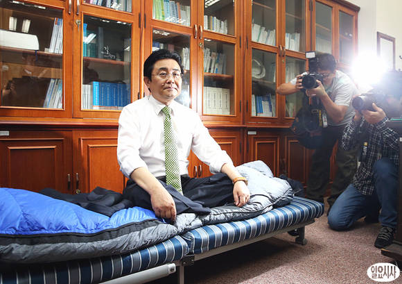 민주당이 24일 오후, 원내투쟁의 지휘본부 격인 24시간 비상국회운영본부를 구성한 가운데, 전병헌 원내대표가 침대 위에서 자세를 취하고 있다.