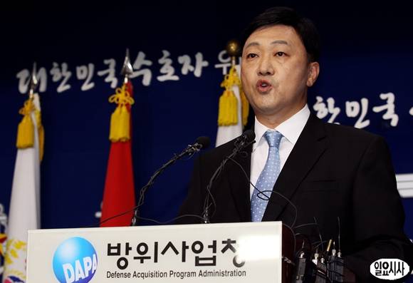 백윤형 방위사업청 대변인이 24일 오후 서울 용산구 국방부 브리핑실에서 차기전투기 선정을 위한 방위사업추진위원회 회의 결과에 대해 브리핑을 하고 있다. 방위사업청은 이날 김관진 국방부 장관 주재로 열린 방추위 회의에서 차기전투기 사업에 단독 후보로 오른 미국 보잉의 F-15SE에 대한 선정안을 심의해 부결했다.